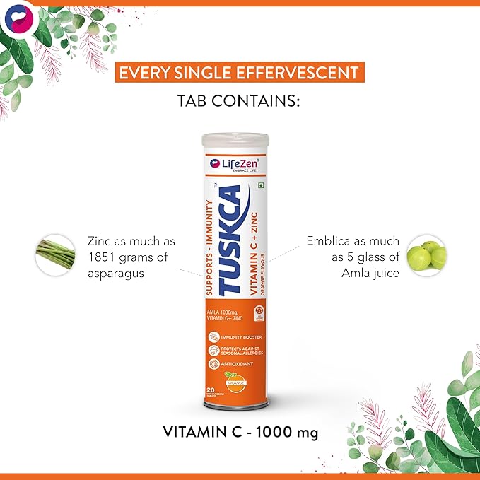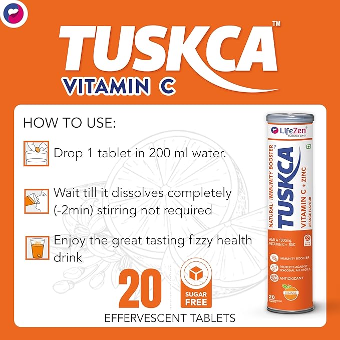 Tuskca Vitamin C + Zinc 1000Mg , Natural Amal Extract Antioxidant, Immunity booster , 20 Effervescent Tablet (Pack of 2) Orange Flavour
