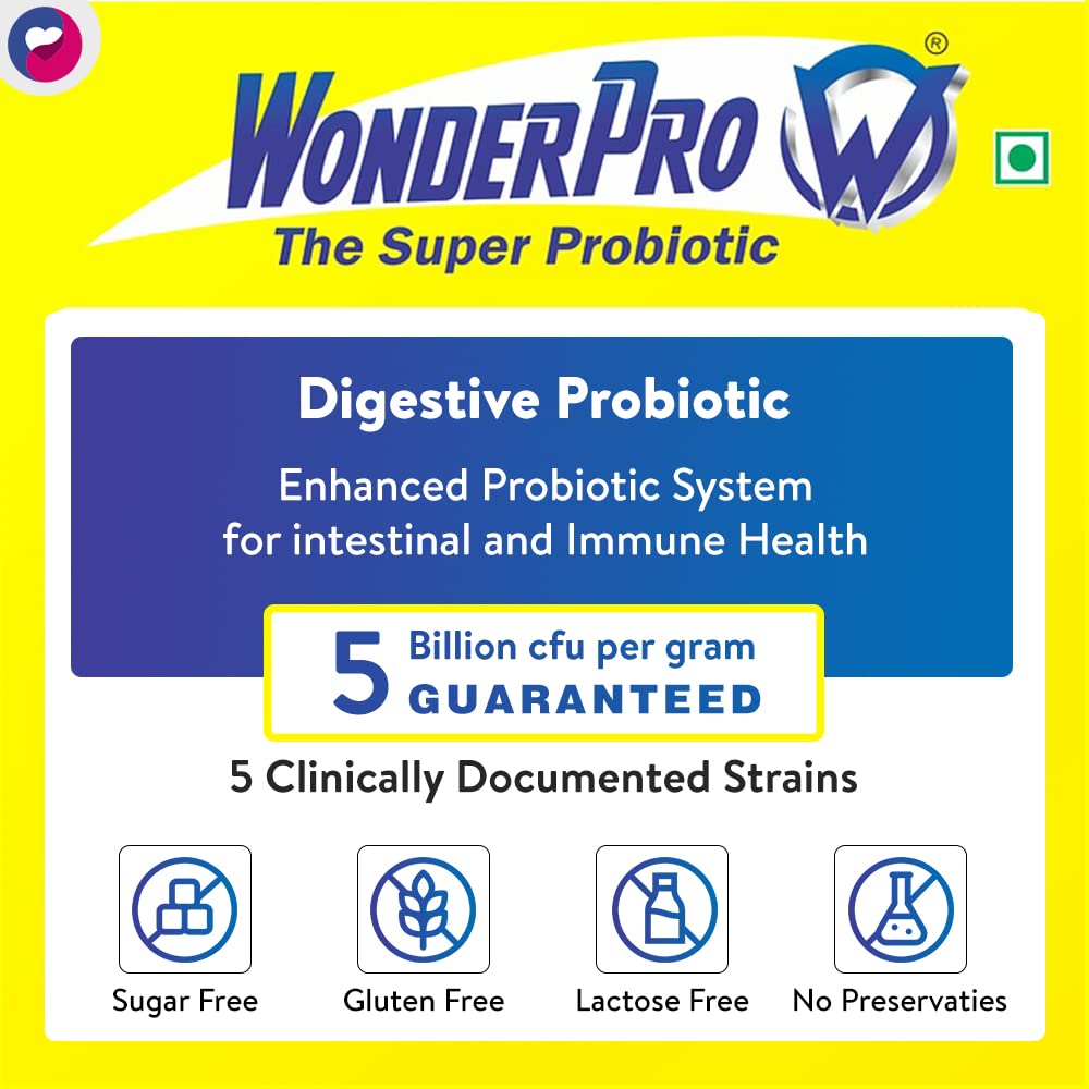 WonderPro super probiotic is a gut health supplement that promotes better gut health and overall wellbeing by boosting immunity. Probiotics maintain a balance among the microbes present in the intestine and support maintaining a healthy gut flora. Probiotics are essential for an active metabolism.